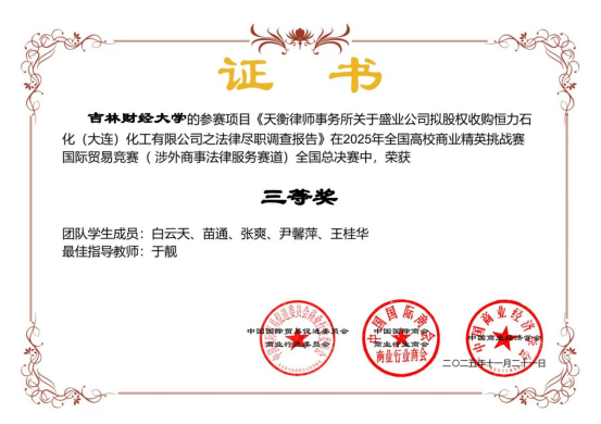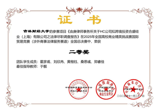 参赛作品包括《由庚律师事务所关于HC公司拟跨境投资合盛硅业(上海)有限公司之法律尽职调查报告》和《天衡律师事务所关于盛业公司拟股权收购恒力石化(大连)化工有限公司之法律尽职调查报告》。在于靓老师的专业指导下,由本科生霍彦甫(队长)、刘欣冉、黄楷钰、桑思彧、郑睿佳,以及研究生白云天(队长)、苗通、张爽、尹馨萍和王桂华所组成的团队,凭借扎实的专业知识和对涉外商事法律服务的深刻理解,协作完成了赛事任务,充分展现出法学院学子优秀的专业水准和团队合作能力。此次成绩不仅体现了吉林财经大学法学院在高素质法律人才培养方面的成效,也是对学生在实务操作与创新思维方面能力的充分肯定。